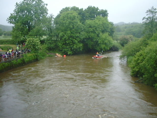 the first sign - the safety boat arrives to a cheer at Blackpool Mill